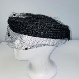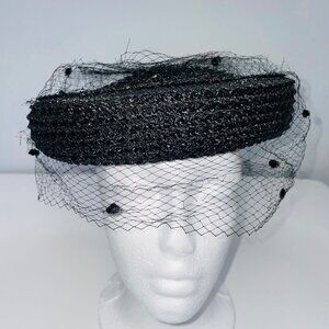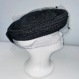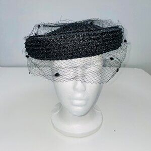 Vintage Womens Hat Black Pillbox Church Netting Bow Wedding Costume Theatre