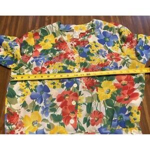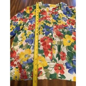 This vintage women's Hawaiian floral top in size 8 features a cinched waist and scalloped hem, perfect for a cottagecore style. The multicolor rayon fabric with a floral pattern and raglan sleeves make it a lightweight and easy-care option for various occasions such as travel, party/cocktail, or casual wear. The round neckline and button closure add to the relaxed fit, while the tunic style and tropical theme bring a touch of beachy flair to your wardrobe.