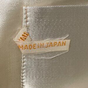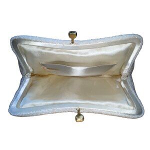 Classic ivory clutch featuring intricate beadwork and gold-tone clasp closure. Satin-lined interior with small pocket. Handmade vintage elegance. Made in Japan.