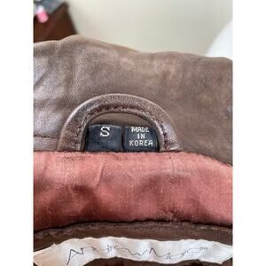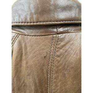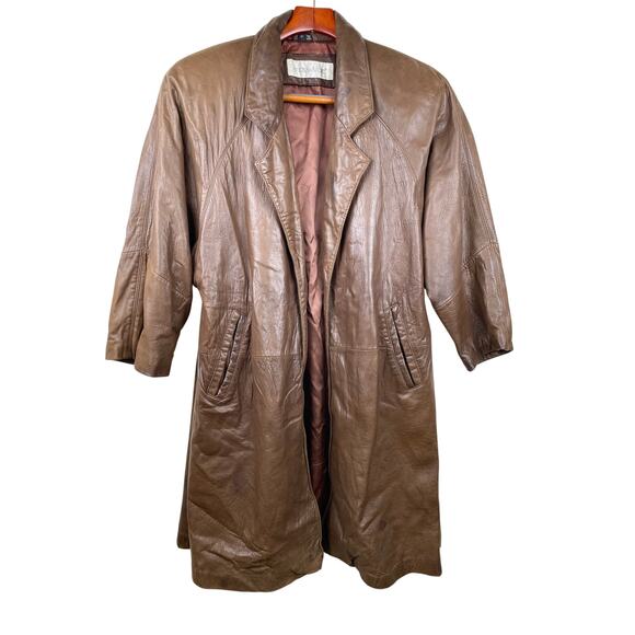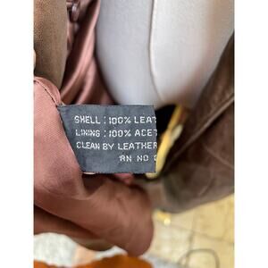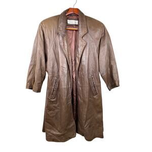 Vintage 80s Andrew Marc Womens Trench Coat Sz S Lambskin Genuine Leather Brown Indie Grunge Hipster Oversized Boho Hippie Double Breasted Open. Inner and outer pockets. Satin Lining. A few small water stains. One small nick. See pics. Soft, Buttery Leather. Shoulder Pads. Swing.