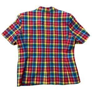 This Joan Leslie blazer combines vibrant colors with a classic plaid pattern, adding a splash of personality to professional outfits. Its short sleeves and button closure offer a versatile option for warmer months or layering.