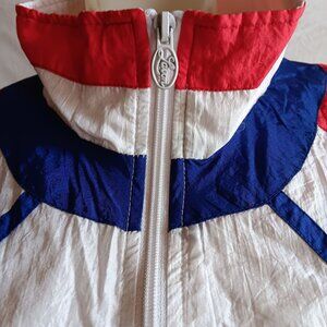 This vintage Lavon windbreaker jacket showcases a striking combination of white, red, blue, and green. Made with a durable nylon and polyester shell, it features a stylish embroidered Marine Club logo. Suitable for casual outings or sporty events, this jacket offers both comfort and retro flair.