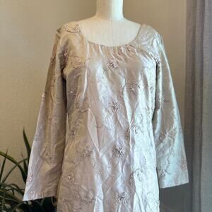 Vintage Women’s Large Tunic Beige Embroidered Sheath Dress Long Sleeve Beaded