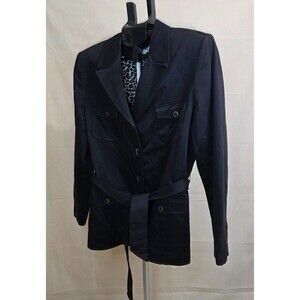 This early-2000s Le Suit blazer blends structure and attitude with its utility-inspired design, featuring four functional pockets, a waist-defining belt, and a standout leopard-print satin lining. The cotton-spandex outer fabric gives it a smooth, tailored feel with a bit of stretch, while the classic black color makes it easy to dress up or down. A polished, confident piece perfect for office looks, night-out styling, or edgy streetwear layering.