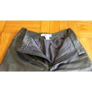 Vintage womems, soft, genuine leather pants, size 6, dark charcoal gray, almost black. Lined to below the knee, seam at knee. Button and zipper fly front. Sits at waist, 2 front pockets, belt loops. Approx measurements: waist laid flat 13in, front rise 11in, back rise 15.5, hips laid flat 17in, inseam 29in, length waist to hem 39in, thigh laid flat 10.5, width of hem laid flat 7.5in.