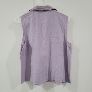 This vintage women's linen button-up shirt in size XL features a purple color with rhinestone accents, giving it a unique and stylish look. The sleeveless design, collared neckline, and button closure make it perfect for casual occasions. The Western and 90s theme adds a touch of flair to the basic style, while the breathable linen material ensures comfort. Ideal for a relaxed fit, this shirt from the brand Hush is a standout piece for any fashion-forward woman.