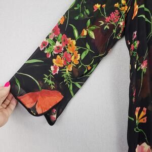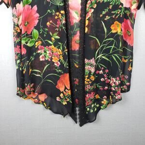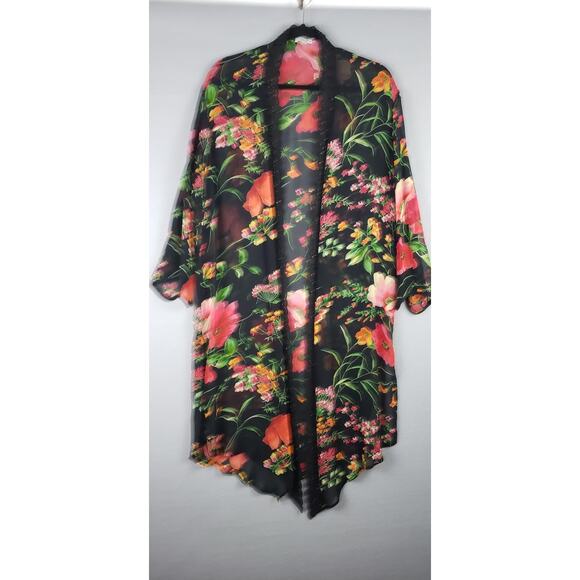 Vintage Women's M Semi Sheer Robe Kimoni Black Floral Beaded Lace Trim