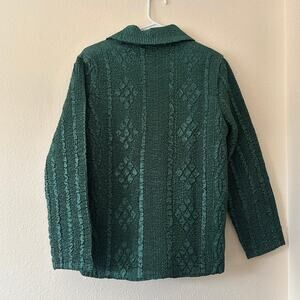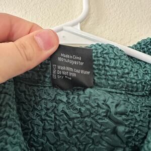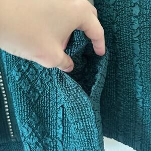 Step into standout texture and bold color with this vintage Magic Scarf brand zip-up jacket in a vibrant emerald green! This piece features Magic Scarf’s signature accordion crinkle texture with a diamond pattern woven throughout, a classic collared neckline, and a striking rhinestone-studded zipper pull that adds the perfect retro glam touch.