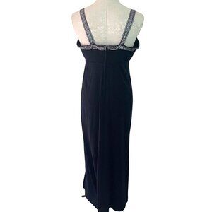 The dress features maxi length with empire waist and silver and black Greek key straps.