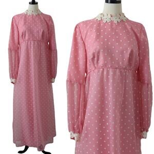 vintage women's dress possibly 1950s 1960s? A full-length floor length maxi polka. velvety dots sheer overlay lines bubble gum pink lace embroidered floral trimming detail bubble sleeve