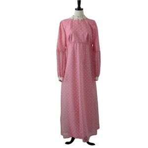Vintage Women's Maxi Dress Small Medium Pink Polka Dot Long Sleeve 1960s 1950s