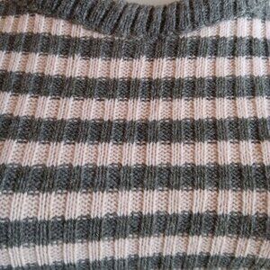 Discover a charming piece of textile history with this vintage knit sweater. Soft heathered grays and warm neutrals interweave in a classic striped pattern, offering timeless elegance and comfortable texture. A versatile layering piece that whispers stories of bygone fashion eras.