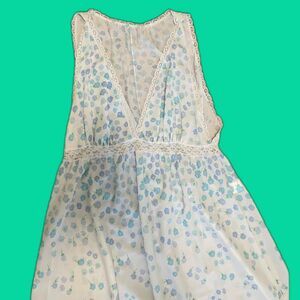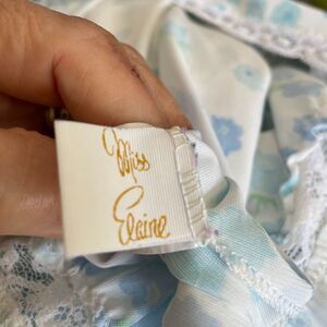 Romantic and dreamy vintage Miss Elaine nightgown featuring a soft white base with a delicate blue floral print. Sleeveless with a flattering V-neck and empire waist trimmed in lace. Long maxi length with flowy drape. Union label indicated 1960s manufacturing date. Perfect as a collector's piece, lounge gown, bridal getting ready robe, film or movie costume, Fabric is nylon. Excellent used condition. Non-smoking home.