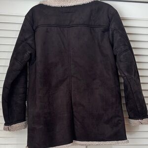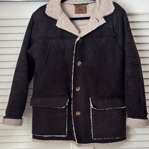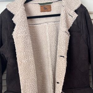Stay warm and stylish with this ladies Moose Creek dark brown field jacket, featuring a cozy sherpa lining and classic button closure. Ideal for a chic, outdoor look. Perfect for days working on the ranch or a night outing. Pair with your favorite scarf and boots for a chic western style. This vintage jacket is in great gently used condition.