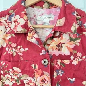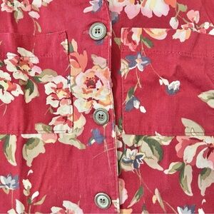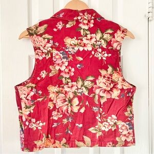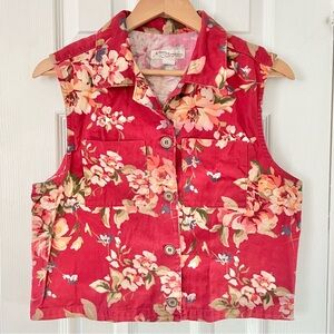 Vintage Women’s Norm Thompson 90s Teacher Vest. Size medium. Button front closure. Two chest pockets. Made in the USA. Red with pink/green floral print. Collared. 100% cotton. In great used condition - no flaws to note. Approximate measurements when laying flat and fully buttoned: