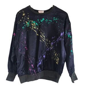 Vintage Womens Paint Splatter Black Satin Sweatshirt Pullover Size L made in USA