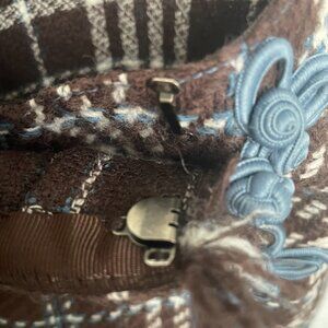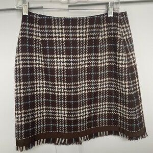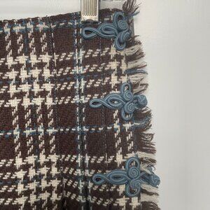 This vintage wool skirt is unique and lovely. With a few pleats on the side, brown, cream and blue plaid fabric, brown gross grain ribbon detail, and blue hook and button decorative outer detailed closure, you will not find this skirt anywhere else Look at the pictures to see its character. It secures nicely with an inside button and clip. Measurements are 15 inch waist, 19 1/2 inch length, and 21 inch width at the bottom. 100% wool and made in Korea by Jon. Please ask any questions before buying.