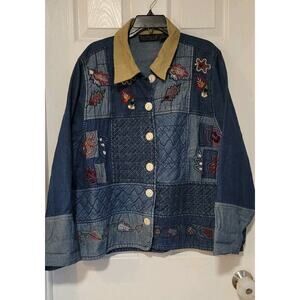 Vintage Womens Quilted Patchwork Denim Jacket Size 1X Embroidered Leaf Button Up