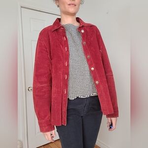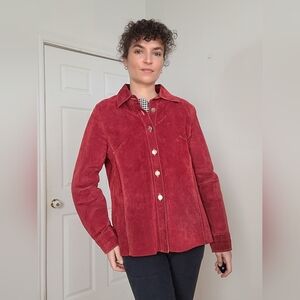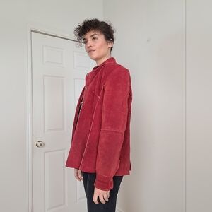 Vintage bright red suede jacket, 100% suede, by Elements, featuring metallic buttons. Size L, detailed topstitching. In good condition.
