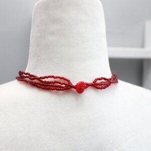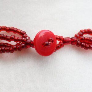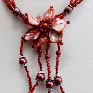 A striking red beaded necklace with a prominent flower pendant featuring multiple strands of seed beads.