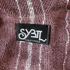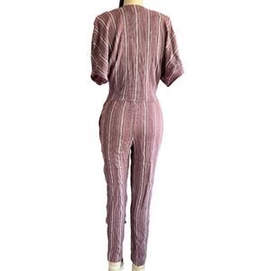 Vintage Sybil California Mauve/Pink Linen Romper. V-Neck, short sleeve, full straight legged pant. White Vertical lines top to bottom. With front pockets. Stretchy/Pull-on. Some small linen fraying - can easily be trimmed up with scissors as needed for this piece.