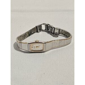 This Vintage Women's Seiko 2E20-5139 RO Watch features a classic rectangular shape with a gold-plated bracelet and Roman numeral indices on a 12-hour dial. Made in Japan in the 1990s, this luxury dress/formal watch has a quartz movement and stainless steel case with a polished finish. With a vintage touch and pilot/aviator style, this untested watch is a timeless piece for any woman's watch collection.