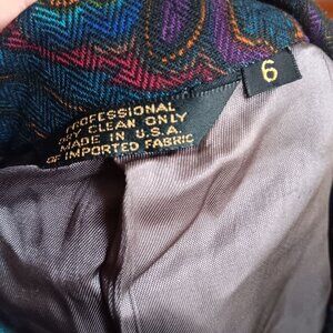 This vintage Corbin Ltd blazer features a striking paisley pattern in rich jewel tones. Its double-breasted design and structured silhouette evoke timeless sophistication, complemented by its quality craftsmanship made in the USA.