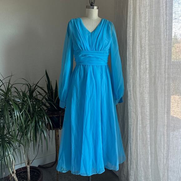 Elegant vintage 1970s gown in a vibrant sky blue chiffon. Features a flattering V-neckline, ruched waist panel, sheer bishop sleeves with elastic cuffs, and a fully lined A-line skirt that floats with movement. Classic, romantic, and perfect for weddings, garden parties, or special occasions. union Made in USA tag