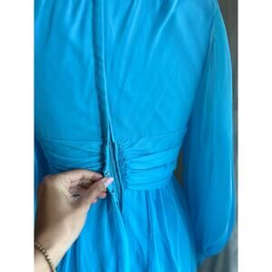 Vintage Women’s Small Dress Blue Sheer Chiffon Long Sleeve V-Neck Ruched 70s