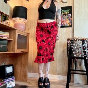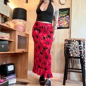 Vintage Women's Small Red Daisy Stretch Maxi Skirt. 90s 2000s era. Bouncy, stretch fabric. Ruffle hemline. Elastic stretch waistband. Can be styled shorter or as a dress :) Tagless but looks vintage and fits like a Small. Vintage, preloved condition, please keep in mind when buying <3