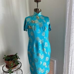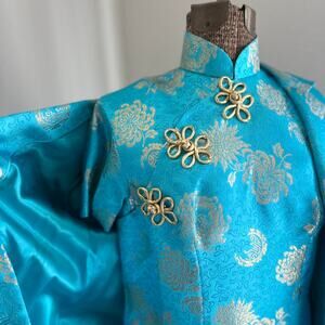 Exquisite vintage turquoise brocade two-piece set featuring a fitted cheongsam-style dress and coordinating tailored jacket. Woven with metallic gold floral motifs throughout