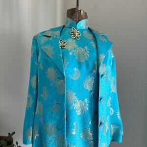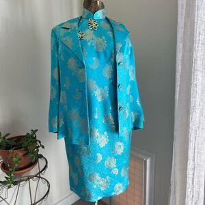 vintage brocade set, mandarin collar dress, turquoise gold dress, 1960s formal set, oriental-inspired fashion, vintage cocktail outfit, jacquard suit dress, elegant vintage style, retro sophistication, metallic brocade two-piece