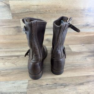 Vintage Shoe Company Short Bootie Leather Biker Riding Work Boots in Brown, size 7.5 (US) or 5.5 (UK). These round toe boots feature a pull-on closure with a flat heel style and a rubber outsole. Made of leather with a biker theme, suitable for casual occasions in winter, summer, fall, and spring. The lining and insole are both leather, providing comfort and durability. Made in the United States.