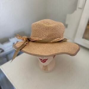 Vintage Women’s Tan Straw Sun Hat Ribbon Band Woven Wide Brim