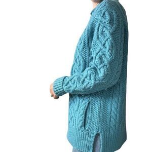 Vintage Womens Teal Blue 100% Wool Chunky Fisherman Celtic Cardigan Sz L