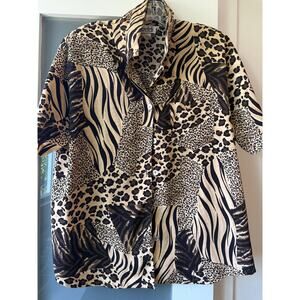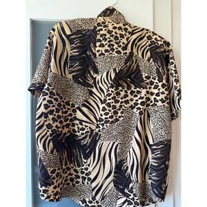 Beautiful condition. Has leopard print, zebra print, and tiger print. Beige and black short sleeve silky blouse.