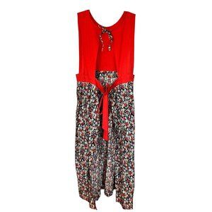 Vintage Womens Tie Apron Handmade Red Top Blue Floral Skirt Wrap Around Bow Long