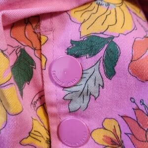 I'm in love with this blazer! Vintage Y2K era. Pink with yellow & orange flowers. Pink tie front. 2 front pockets. Pleated back for a better fit. Pink snaps on cuffs that say Tommy Jeans. One tiny spot on one snap (see pics). Overall this is in EUC.