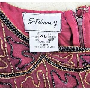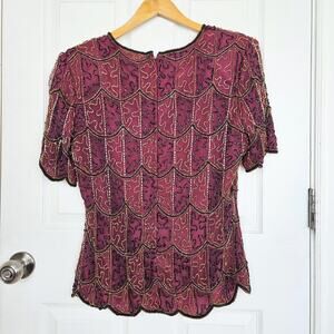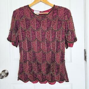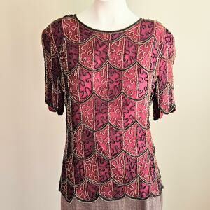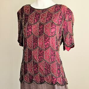 Vintage 100% silk fully beaded top by the brand Stenay. In a burgundy color with black and gold beading. This top has a round neckline, and scalloped edges at the sleeve and bottom hem. Made in India. Has shoulder pads. Marked as an XL. See measurements.