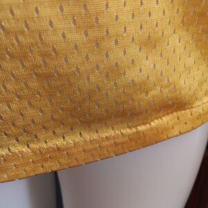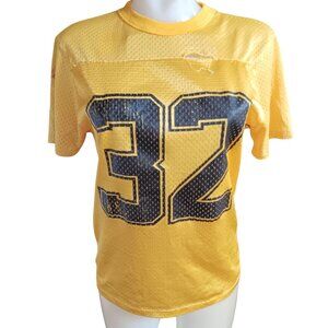 Step back in time with this vintage yellow mesh football jersey, featuring a bold number 32. The breathable mesh fabric and classic design evoke nostalgic sports memories. Despite its age, the jersey remains a testament to past athletic glory days, making it a collectible piece for vintage sportswear enthusiasts.