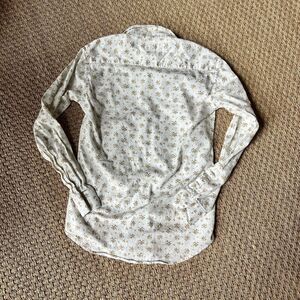 Get ready to rock this vintage women's US Polo Assn button-up blouse in size large! The classic-fitted long sleeves and collared neckline make it the perfect choice for a casual or workwear occasion. The golden floral pattern, button accents, and white cotton material combine for a stylish and comfortable fit. This blouse is machine washable for easy care and has a vintage feel for an added touch of uniqueness. The US Polo Assn brand ensures a classic fit and regular size type. This basic button-up top is perfect for any wardrobe! *Please see photos for wear and measurements