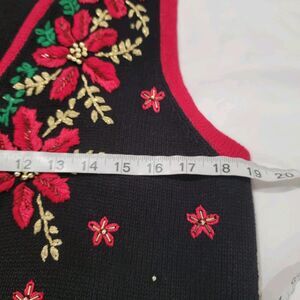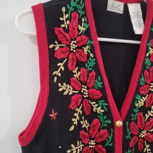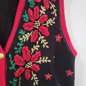 This vintage women's Ugly Christmas Sweater Vest in size medium features a floral poinsettia pattern in a tight-knit black fabric. The sleeveless vest has a V-neckline and is adorned with button, beaded, and embroidered accents. Perfect for various occasions such as travel, party, or casual wear, this retro piece exudes a festive holiday charm with a hint of 80s style. Made from a blend of Ramie and cotton, this unique vest adds a touch of nostalgia to your winter or fall wardrobe.