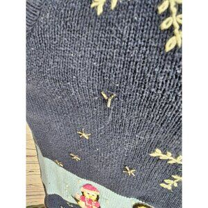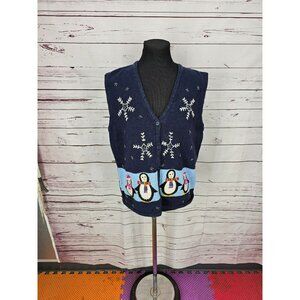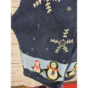 Vintage Womens Winter Sweater Vest Blue Knitted with Penguins and Snowflakes Siz