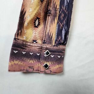 This vintage Wrangler womens western shirt features a bold Southwestern Aztec-inspired pattern in shades of gold, brown, and navy. Designed with classic western styling, it includes pointed front and back yokes, snap button closure, and flap chest pockets with pearlized snaps. A true rodeo cowgirl core piece, perfect for western wear collectors or anyone who loves retro Wrangler style.