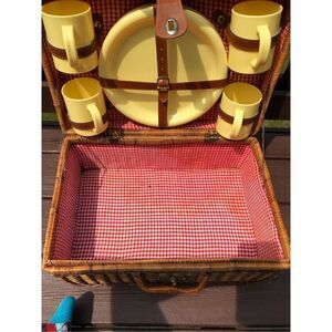 Vintage Women’s Brown Picnic Wicker Basket with Red and White Gingham Plaid Lining and Yellow Table Set Preowned in good condition has some stains on inside and a corner of the basket is coming undone slightly sold as is