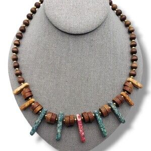 Vintage Wood Bead Alternating Gold Tone Spacers Natural Stone Drop Necklace Boho