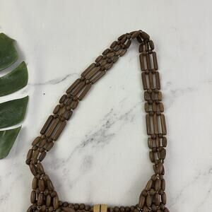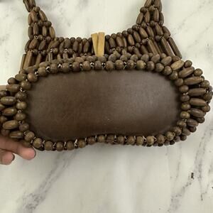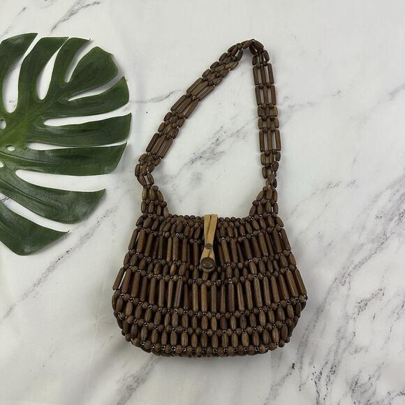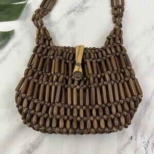 Vintage Wood Beaded Shoulder Bag Purse Brown Boho Tropical Small Festival