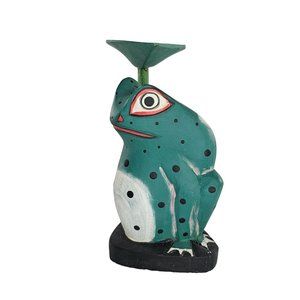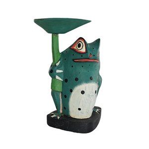 Vintage Wood Carved Frog Leaf Umbrella Folk Art Hand Painted