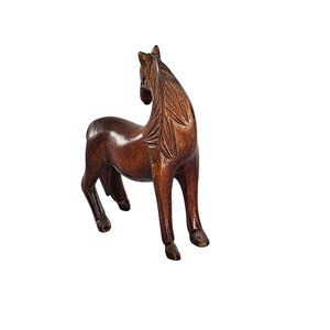 Delicate, hand-crafted vintage wooden horse figurine, with a unique looking-back design. Beautifully carved brown wood reflects the rustic charm of folk art.