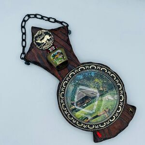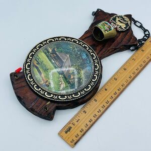 May have been made in Switzerland based on similar items I saw online. Nice decorative wall hanging with hooks under (one missing rubber nub). Hang from mini chain at top. Plastic dome covering mountain art scene. See all images for more info and details.